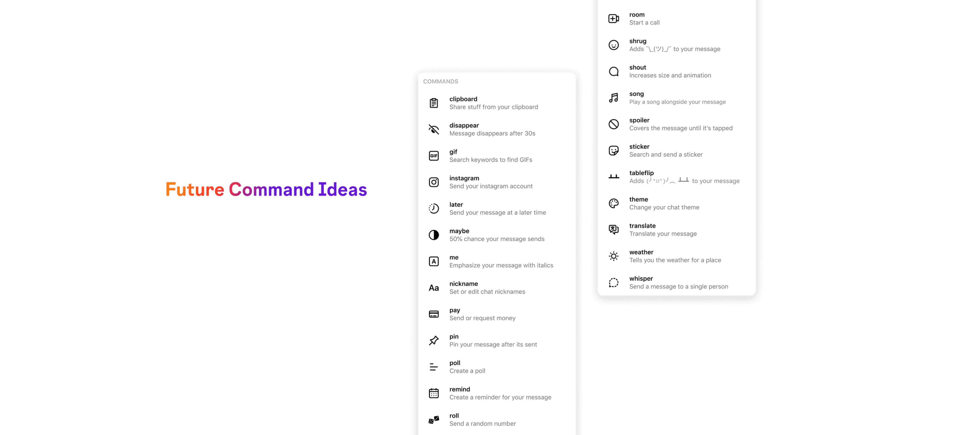 . I generated ideas in 3 "buckets" that lay the foundation of the commands primitive, and evaluated